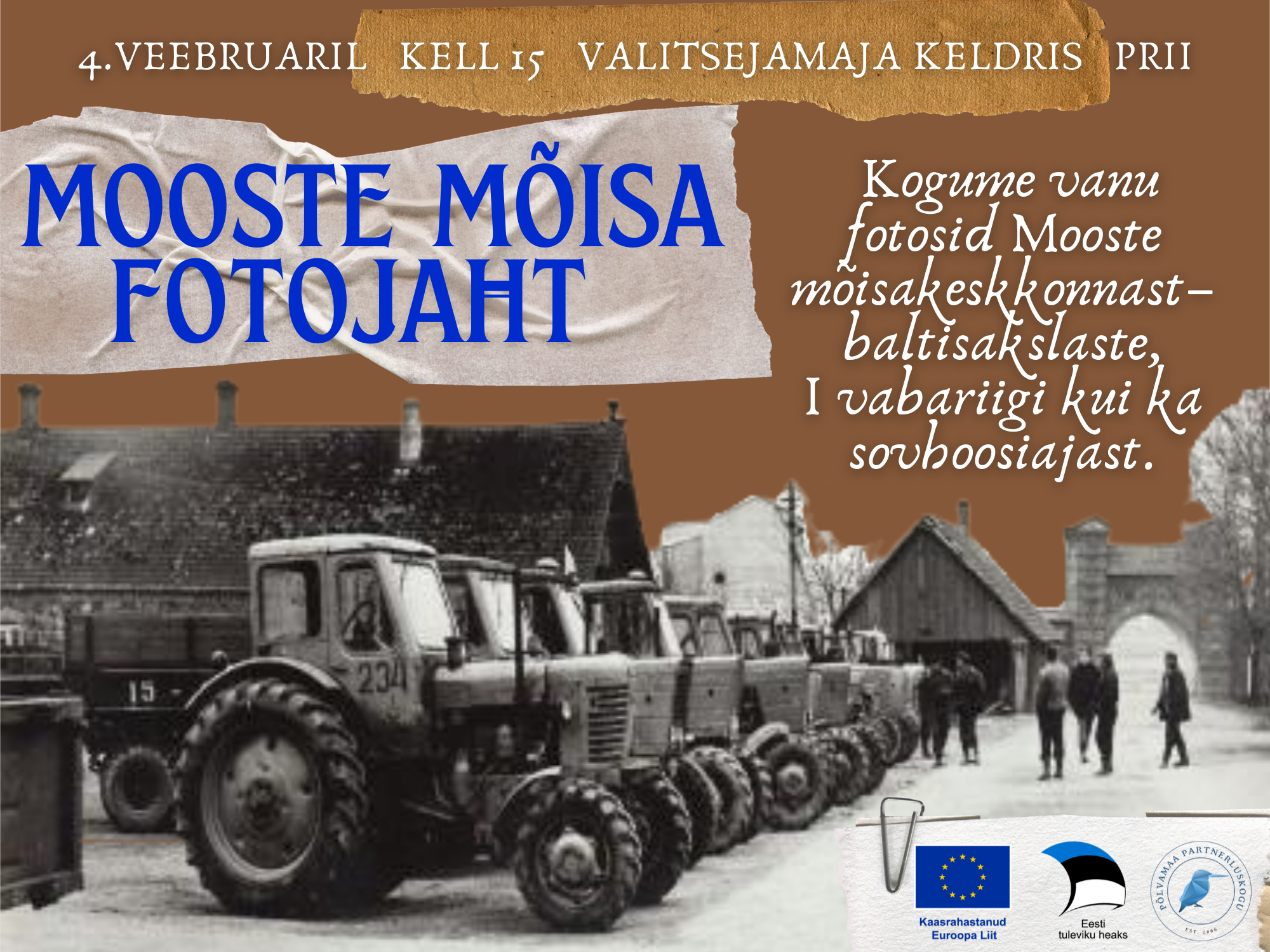 Kutsume teid oma vanade fotodega 4. veebruaril valitsejamaja keldrisse (sissepääs poepoolsest otsast), kus kella kolmest neljani fotograaf John need kohapeal kohe kopeeritud saab.